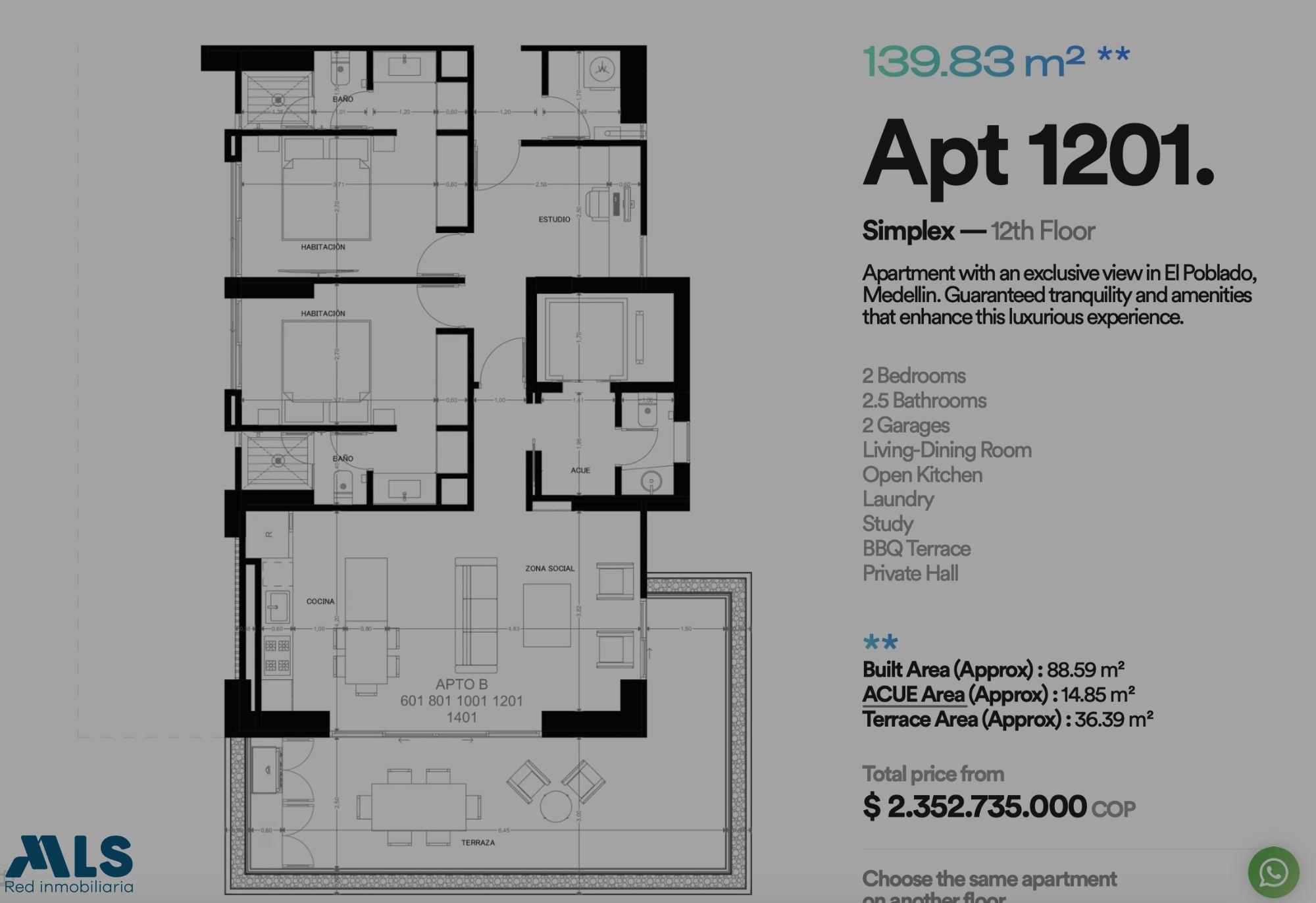 Elige entre vivir o alquilarlo para estancias cortas, medianas o largas. En ubicación privilegiada en Lalinde, rodeado de lugares de interés como el Parque Lleras, el Parque del Poblado, Provenza y una amplia variedad de restaurantes y tiendas exclusivas.Cuenta además con SPA, BBQ, Gym, Piscina y coworking. PLAN DE PAGOS: 10% del valor del apartamento al momento de la firma del contrato ante la fiduciaria (primera cuota del plan de pagos) 40% del valor del apartamento financiado a 29 meses (pueden hacer pagos mensuales, trimestrales o semestrales) 50% del valor del apartamento en el momento de entrega y escrituración (primer semestre 2027)