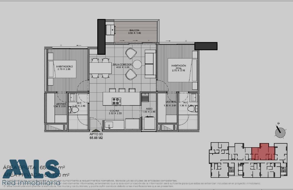 Apartment in Sabaneta, in the Golden Block. Excellent investment and/or residential opportunity. This apartment features a butterfly layout, providing greater privacy and independence between the two bedrooms. It includes two full bathrooms, a balcony, one parking space, and one storage room. Located on a high floor with unobstructed views to the west. Situated in the most strategic and central area of Sabaneta, on flat land, it's just a short walk from the main park and offers easy access to the La Estrella Metro station, shops, services, and main roads. The project is geared towards short-term rentals, ideal for investors seeking high occupancy and profitability without sacrificing quality of life. It offers complete common areas: a gym, coworking space, lap pool, sauna, Turkish bath, yoga and reading spaces, and a laundry area. Estimated delivery: March 2026. A solid investment opportunity in one of the fastest-growing areas in the southern Aburrá Valley.