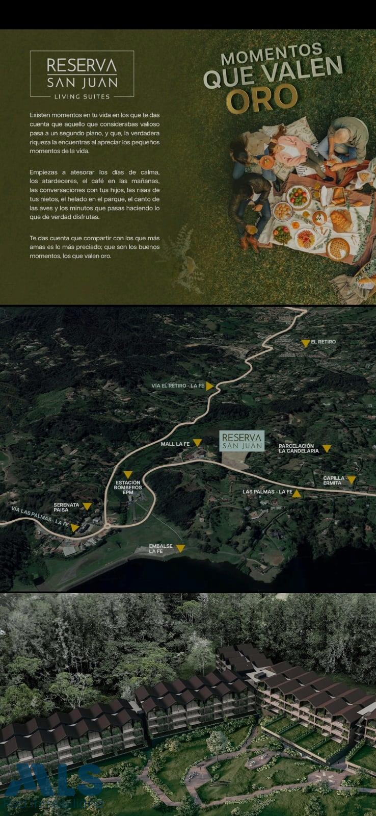 Apartment Suite in El Retiro: Tasteful comfort and sophistication. Brand new! Immediate occupancy! Reserva San Juan is located in El Retiro, just 25 minutes from Medellín, in the Mall La Fe area. Unique and exclusive spaces that are the result of reinterpreting the wisdom of nature and blending it with avant-garde luxury design, using carefully selected raw materials that guarantee sustainable living. The project features 132 uniquely designed suites and luxury services with hotel-quality amenities. Suites for living with everything at your fingertips. 1 bedroom, open kitchen, and windows with unique views. Living/dining room, 1 bathroom, 1 parking space, 1 storage unit. Common areas: Surrounded by 8,000 m2 of forest and state-of-the-art common areas such as: a fully equipped coworking space, golf simulator, spa area, game room, children's playground, and walking trails. Contact me for more information.