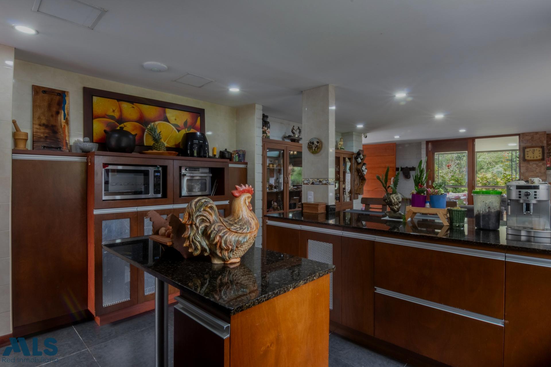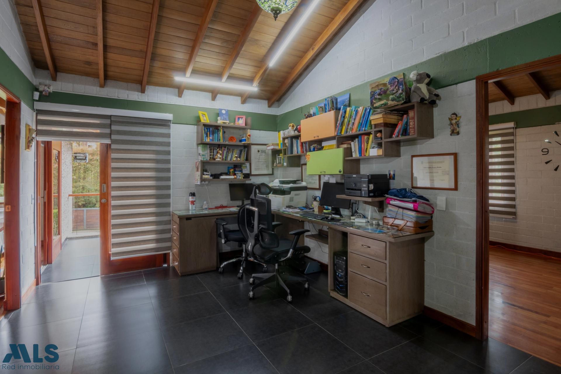 Beautiful 3-level house in the Altos del Escobero area, a quiet area surrounded by greenery, just 10 minutes from the main park of Envigado. 340 m2 built and 6,797 m2 lot area, distributed in 3 bedrooms each with a full bathroom, another full bathroom on the 2nd level, living room, study, library, open kitchen, garden, it has a mezzanine on the top level that is currently used as an office, it has a basketball court, sauna and jacuzzi in the master bedroom.