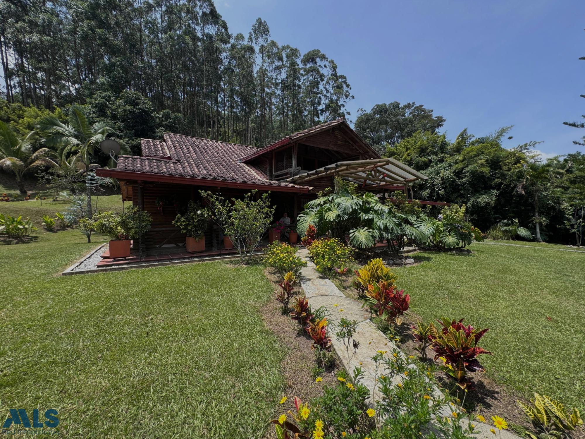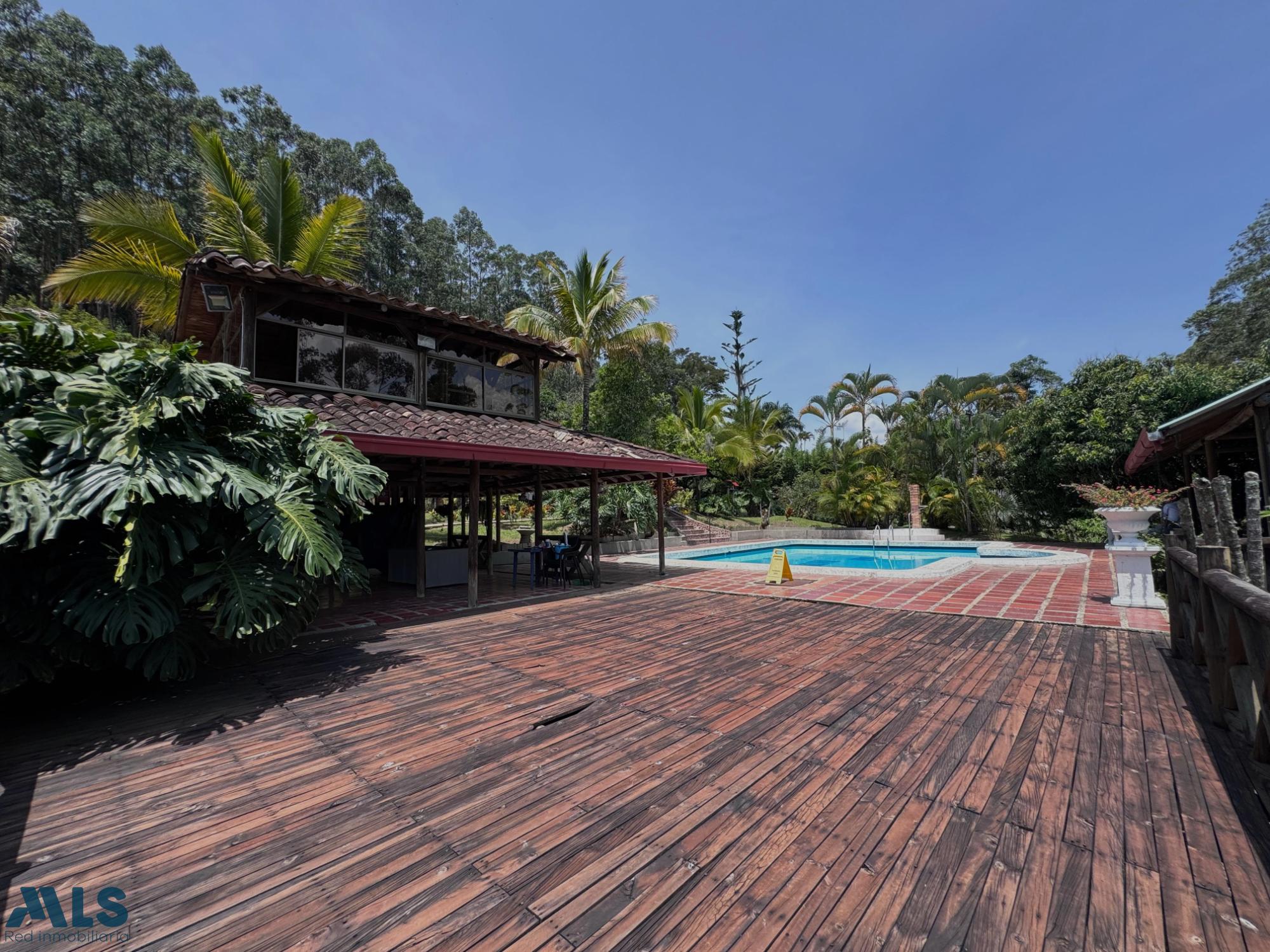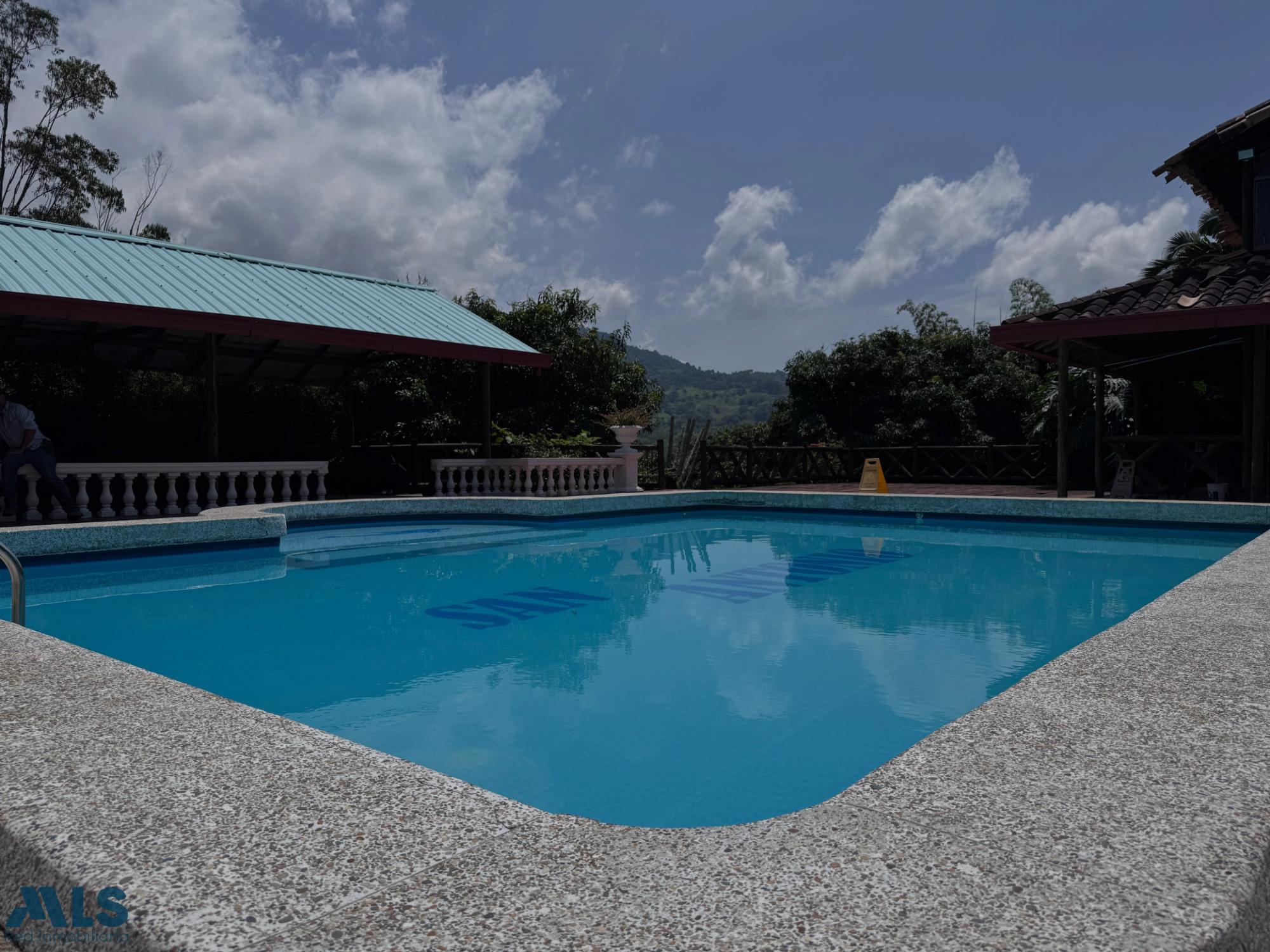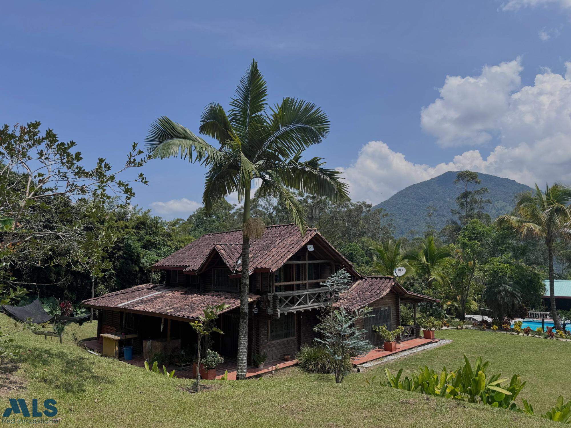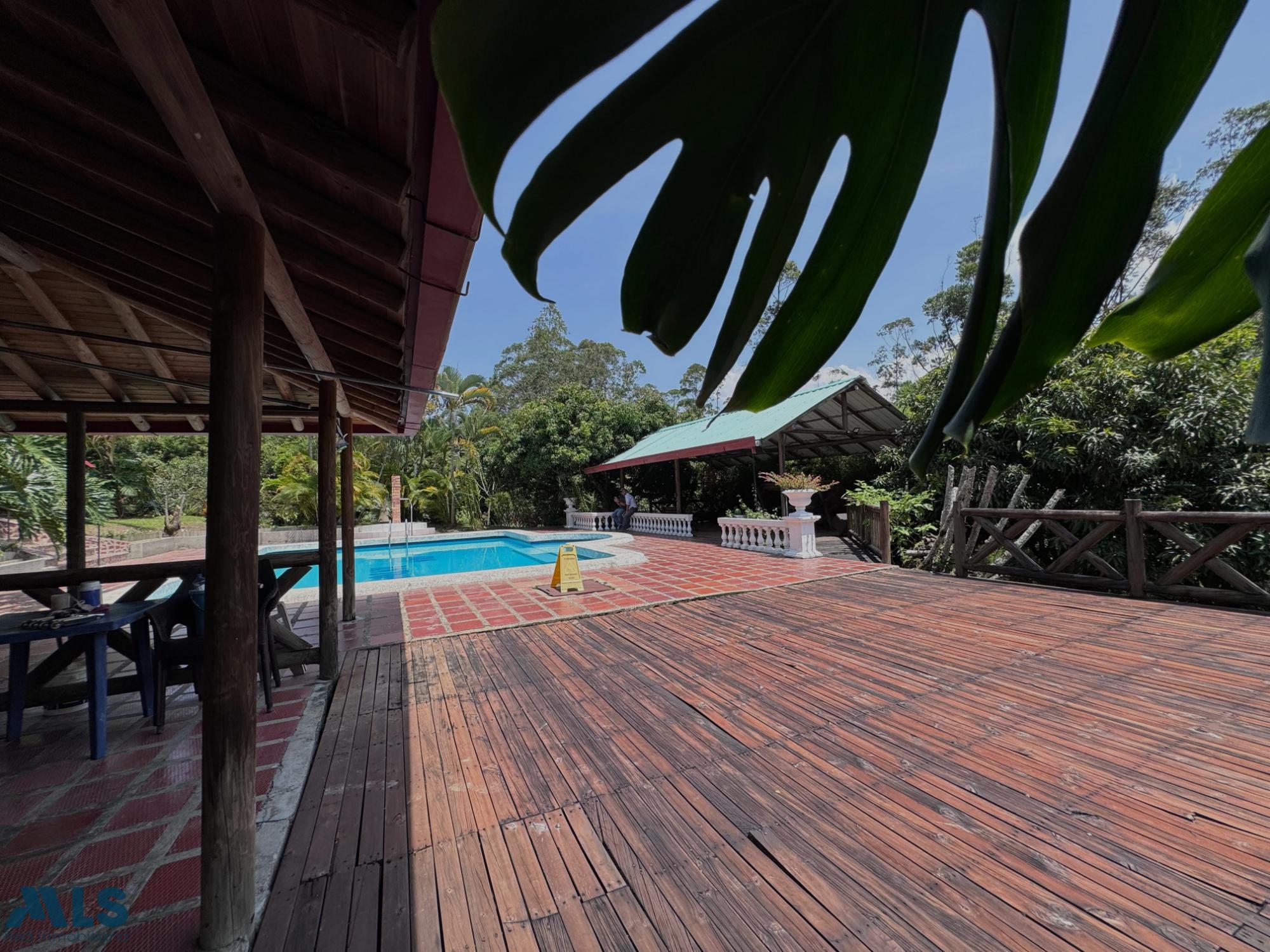 GM - FARM FOR SALE IN VEREDA EL CINCO, FREDONIA, ANTIOQUIA. Two-story farm with a constructed area of 255.35 m2 and a lot size of 9,600 m2. The house features 4 bedrooms, 3 with en-suite bathrooms, a full guest bathroom, a spacious living and dining room, a study, a balcony, a water heater, a laundry area, a patio, a garden, a terrace, 2 covered parking spaces, and beautiful natural views. The property includes security, a children's playground, a swimming pool, green areas, and a pet area. It has security cameras, was remodeled in 2018, and includes a caretaker's house and 3 kiosks. Located in a rural residential area, it has access to both community and spring water (4 reserve tanks), is 10 minutes from the town center, and is close to a main road, with convenient access and public transportation nearby.